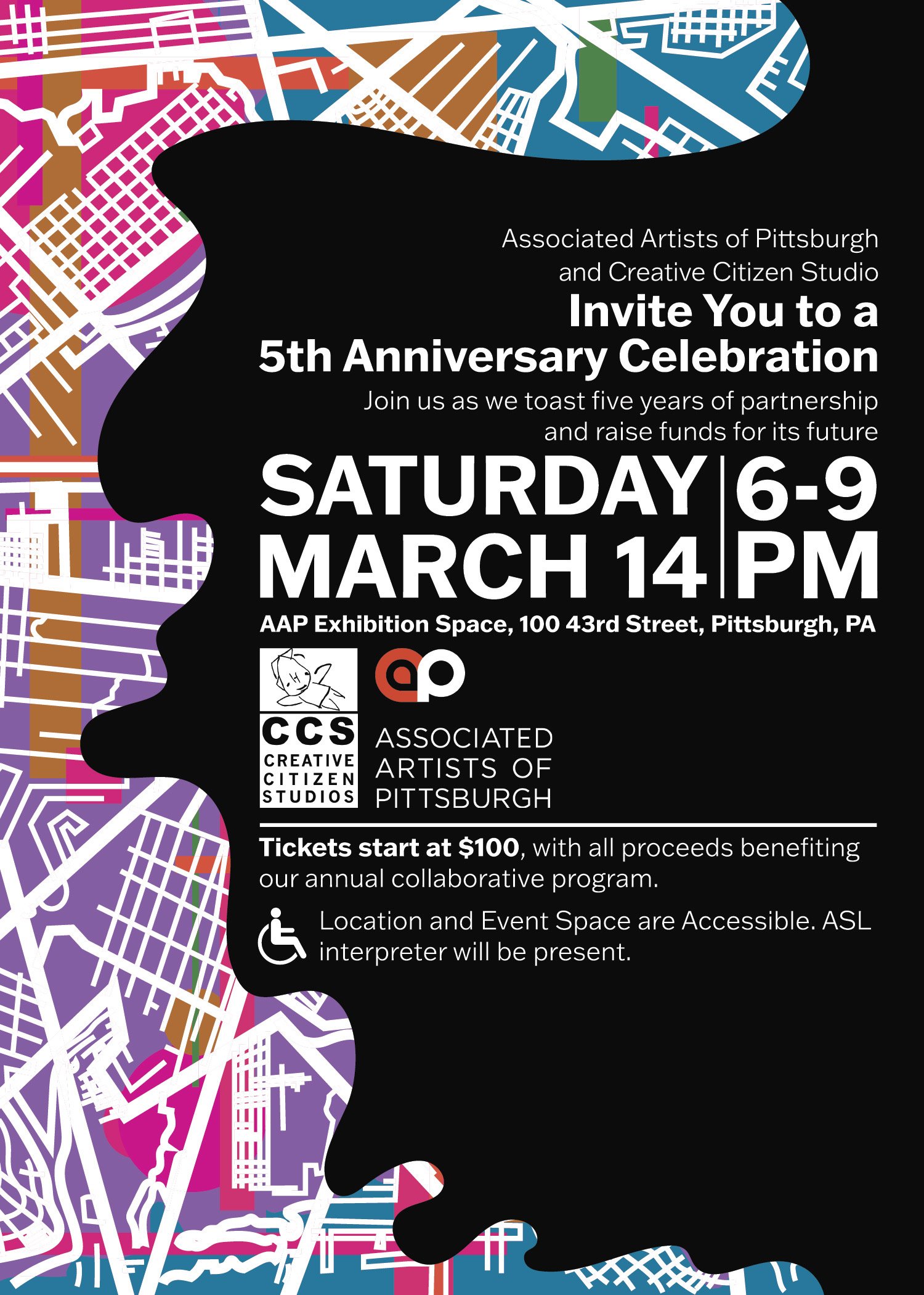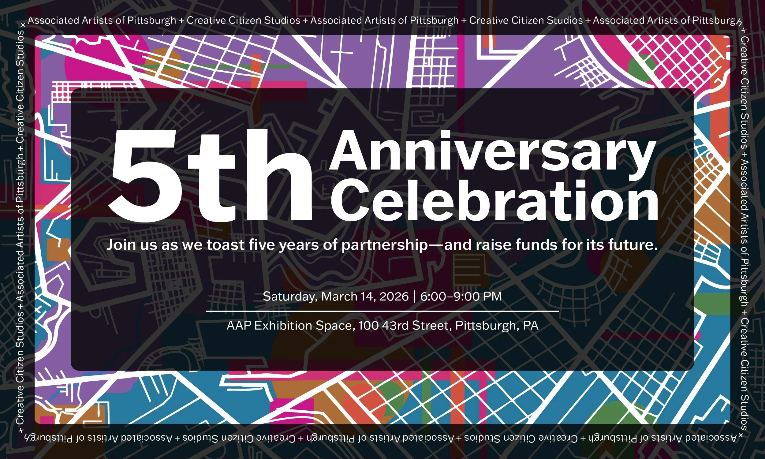 Associated Artists of Pittsburgh and Creative Citizen Studios invite you to our 5th Anniversary Celebration. Join us, Saturday, March 14th at Associated Artists of Pittsburgh's Exhibition space to toast five years of partnership — and raise funds for its future.